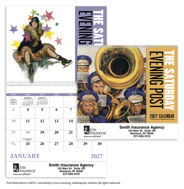 Post illustrations (c)SEPS. Licensed by Curtis Licensing, Indianapolis, Indiana. All rights reserved. Combining Styles: Minimum total per order must be 50. You can mix themes in minimum quantities of 50 per theme, but they MUST have the same binding. Imprint color and ad copy must remain the same for the entire order.