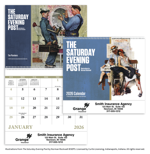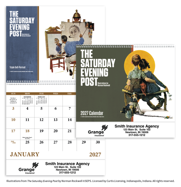 Featuring Saturday Evening post covers by Norman Rockwell, this calendar will give both young and old a look at days of yesteryear in this 13-month calendar. Price includes 1 color print, 1 location (bottom). Bulk envelopes, add $.25 each; inserted, add $.50 each. Full color imprint available, add $.10 each.