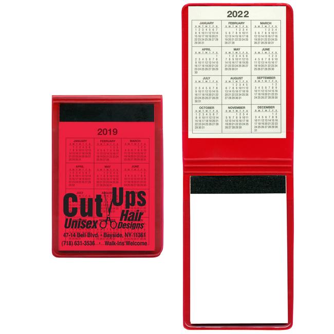This item has a clear pocket on the inside of the cover to hold small cards such as business cards and includes a 30 page pad. A 2 year calendar card is inserted in the inside pocket. Made in the USA.