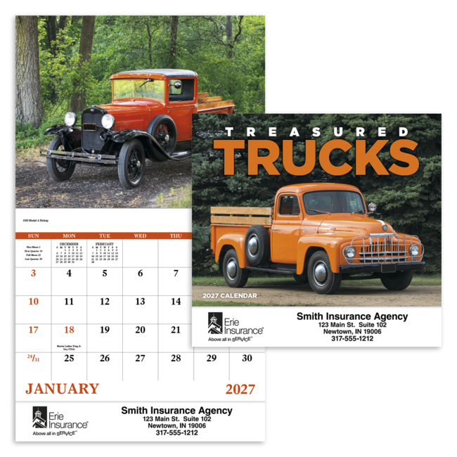 Trucks from years gone by deliver your message every day! 13-month calendar. Bulk envelopes, add $.25 each; inserted, add $.50 each. Full color imprint available, add $.10 each. Product pricing includes up to 5 lines of text with 1 imprint color on gloss paper stock with UV coated cover.