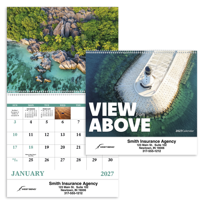 Immerse yourself in a whole new perspective with this 13-month calendar featuring photographs from a birds-eye view. Price includes 1 color print, 1 location (bottom). Guaranteed inventory. Bulk envelopes, add $.25 each; inserted, add $.50 each. Full color imprint available, add $.10 each.