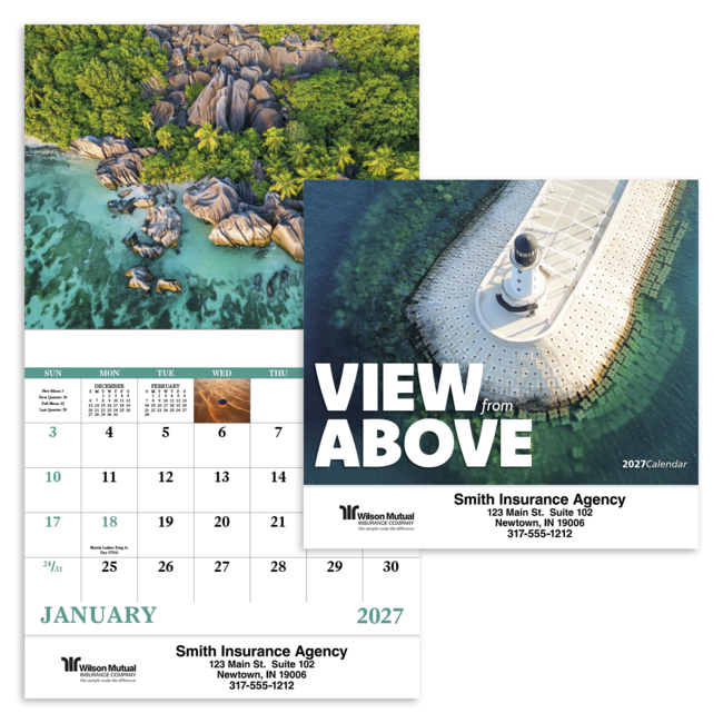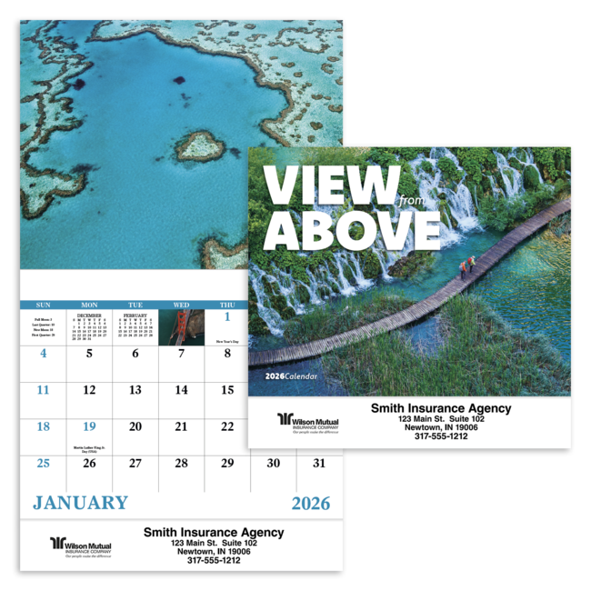 Immerse yourself in a whole new perspective with this 13-month calendar featuring photographs from a birds-eye view. Product pricing includes up to 5 lines of text with one imprint color on gloss paper stock with UV coated cover. Bulk envelopes, add $.25 each; inserted, add $.50 each. Full color imprint available, add $.10 each.
