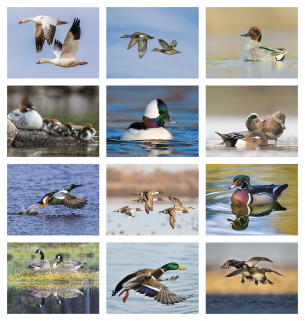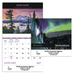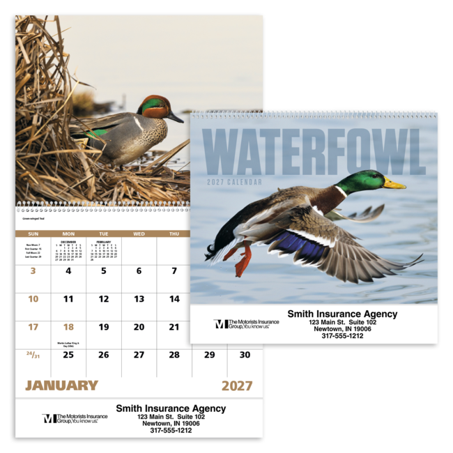 This 13-month calendar features images that capture the grace and beauty of North American waterfowl.. Price includes 1 color print, 1 location (bottom). Bulk envelopes, add $.25 each; inserted, add $.50 each. Full color imprint available, add $.10 each.