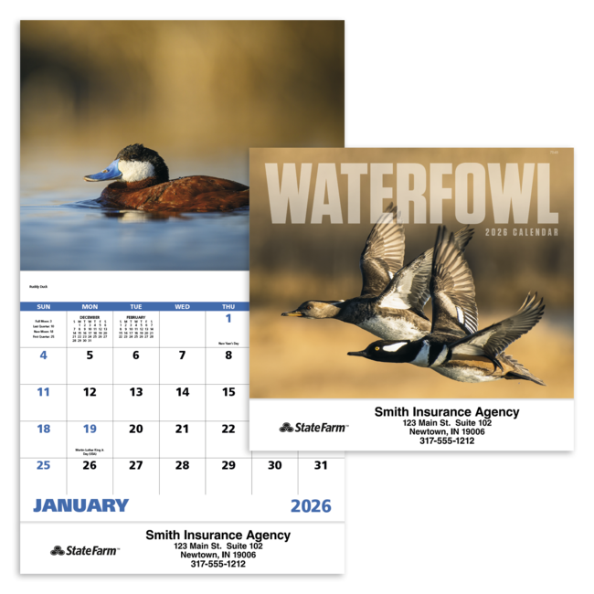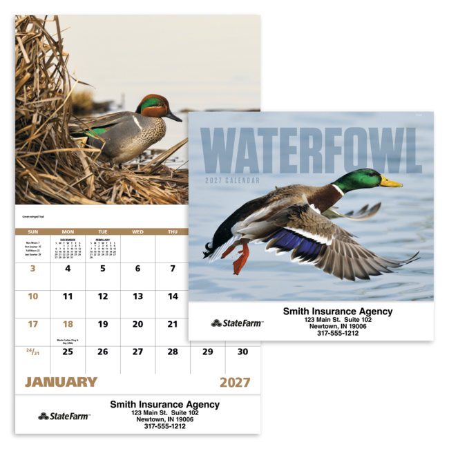 This 13-month calendar features Images capture the grace and beauty of North American waterfowl. Eye-catching images will draw attention to your add all year long. Bulk envelopes, add $.25 each; inserted, add $.50 each. Full color imprint available, add $.10 each. Product pricing includes up to 5 lines of text with one imprint color on gloss paper stock with UV coated cover.
