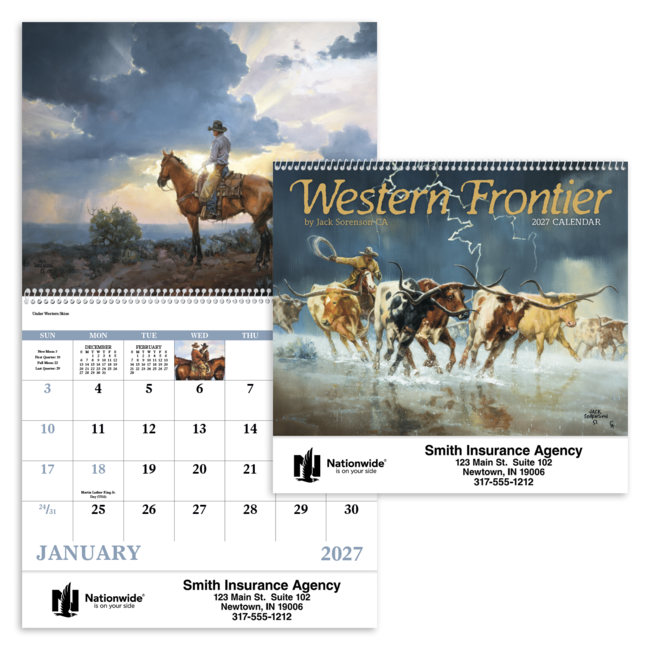 Artist Wayne Cooper brings the West to life in this colorful and nostalgic 13-month calendar. Price includes 1 color print, 1 location (bottom). Bulk envelopes, add $.25 each; inserted, add $.50 each. Full color imprint available, add $.10 each.
