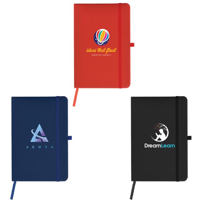 The Wilde Softy Journal is a medium-size hardcover notebook with premium soft-touch finish. It contains 80 sheets of lined ivory paper, which measures 5.5”w x 8.25”h, and also features a color-matched pen loop holder, ribbon bookmarker, and an elastic closure. Customize with a full-color inkjet imprint. Available in black, red and blue.