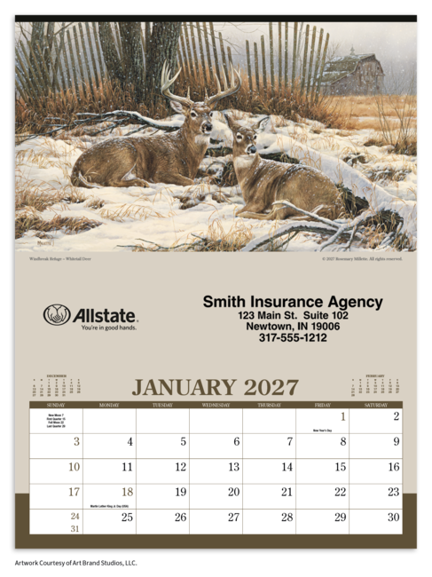 Make your office or home decor come to life with reproductions of paintings by well-known artists. No set-up charge. Inserted in tubes, add $1.25 each calendar.