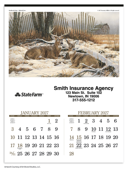 Go into the wild with this calendar. Top wildlife artists capture animals in their natural settings. This artistic and realistic wildlife calendar is sure to grab attention for any advertisement. The FSC® label means that the materials used for this product come from well-managed FSC®-certified forests and other controlled sources. Price includes a 1 color print. Pricing shown is for insurance agents only.