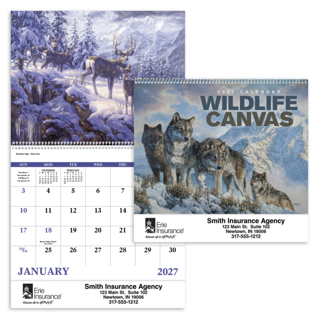 Enjoy vibrant, detailed paintings of North American wildlife in this calendar. Price includes 1 color print, 1 location (bottom). Bulk envelopes, add $.25 each; inserted, add $.50 each. Full color imprint available, add $.10 each.